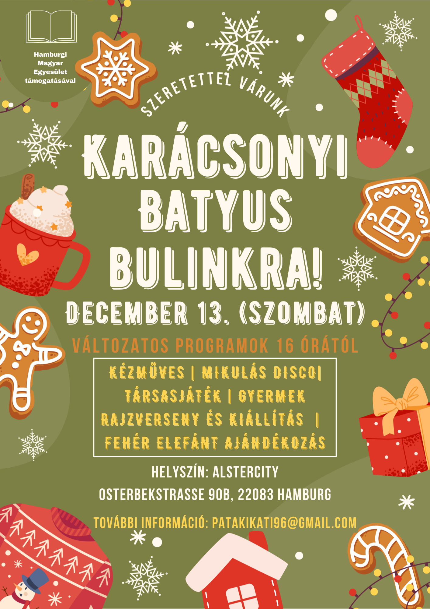Várunk szeretettel december 13-án (szombaton) az AlsterCity kistermébe (Osterbekstraße 90B, 22083 Hamburg) a HMI foglalkozások után, hogy együtt töltsünk egy ünnepekre hangolódó estét, ahol a kikapcsolódásé és a szórakozásé a szerep!