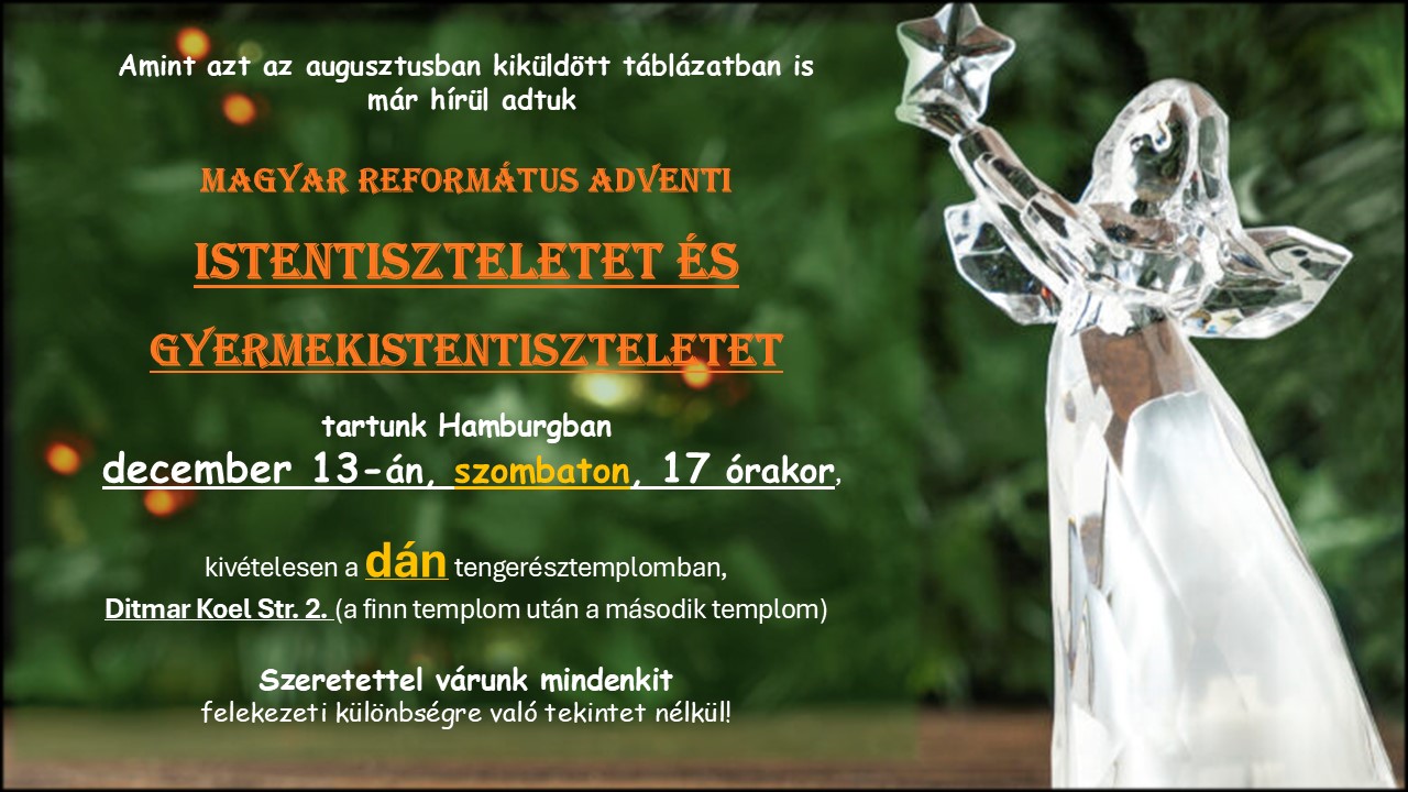 Magyar református adventi Istentisztelet és Gyermekistentisztelet lesz december 13-án (szombat) 17:00 órától a dán tengerésztemplomban – Ditmar Koel Str. 2. (a finn templom utáni második templom).