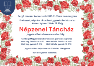 Deutsche Version unten Kedves Érdeklődők! Örömmel jelentjük, hogy november 15-én ismét táncházat és koncertet is tartunk, a Sergő zenekar érkezik hozzánk Magyarországról! https://www.facebook.com/sergo.zenekar A zenekar négy fős, jön velük énekes, … Bővebben: Táncház Hamburgban a Sergő zenekarral! 2025.11.15.