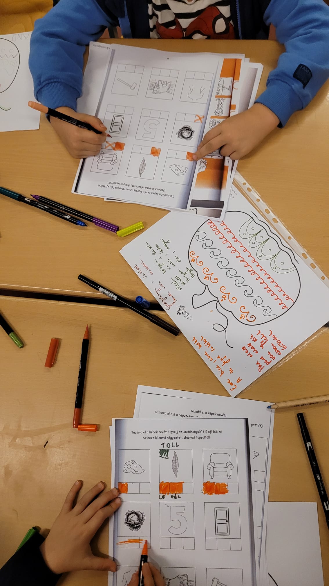 A tök kapcsán „tökös” mondókák ritmusára díszítettünk tököket, majd megismerkedtünk a T hanggal. 🔤